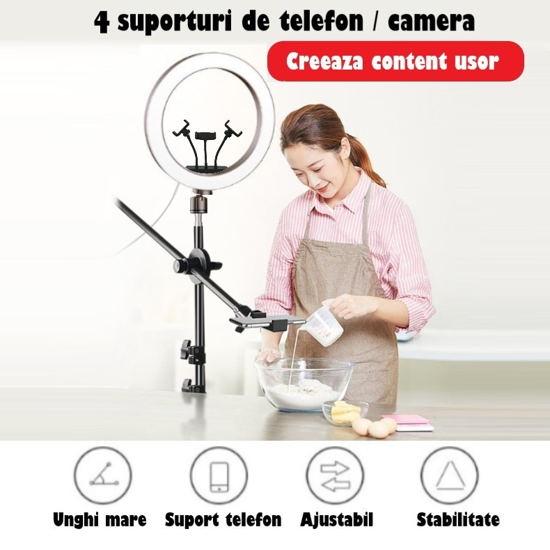 Nota: Lampa include trepied, extra brat ajustabil ,4 x suport pentru telefon si telecomanda Bluetooth + Adaptor priza (CADOU)