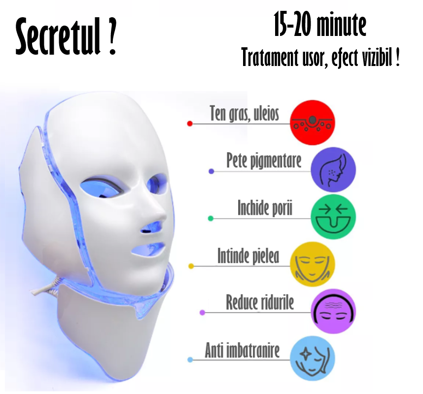 Lumina cyan: Reduce inflamatia de la nivelul pielii cauzata de acnee sau alte probleme ale tenului, precum punctele negre, imbunatateste aspectul tenului gras, ajuta la sintetizarea colagenului.