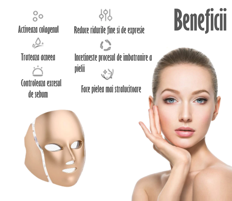 Masca faciala este creata dintr-un material de plastic dur si rezistent, ceea ce il face un produs de inalta calitate. In interior este formata din 192 LED-uri care patrund in prounfizmea pielii pentru efecte mult mai benefice asupra tenului. In zona ochilor sunt pozitionate pernitele din silicon pentru a proteja ochii, dar si pentru un confort sporit pe toata durata sedintei de tratament.