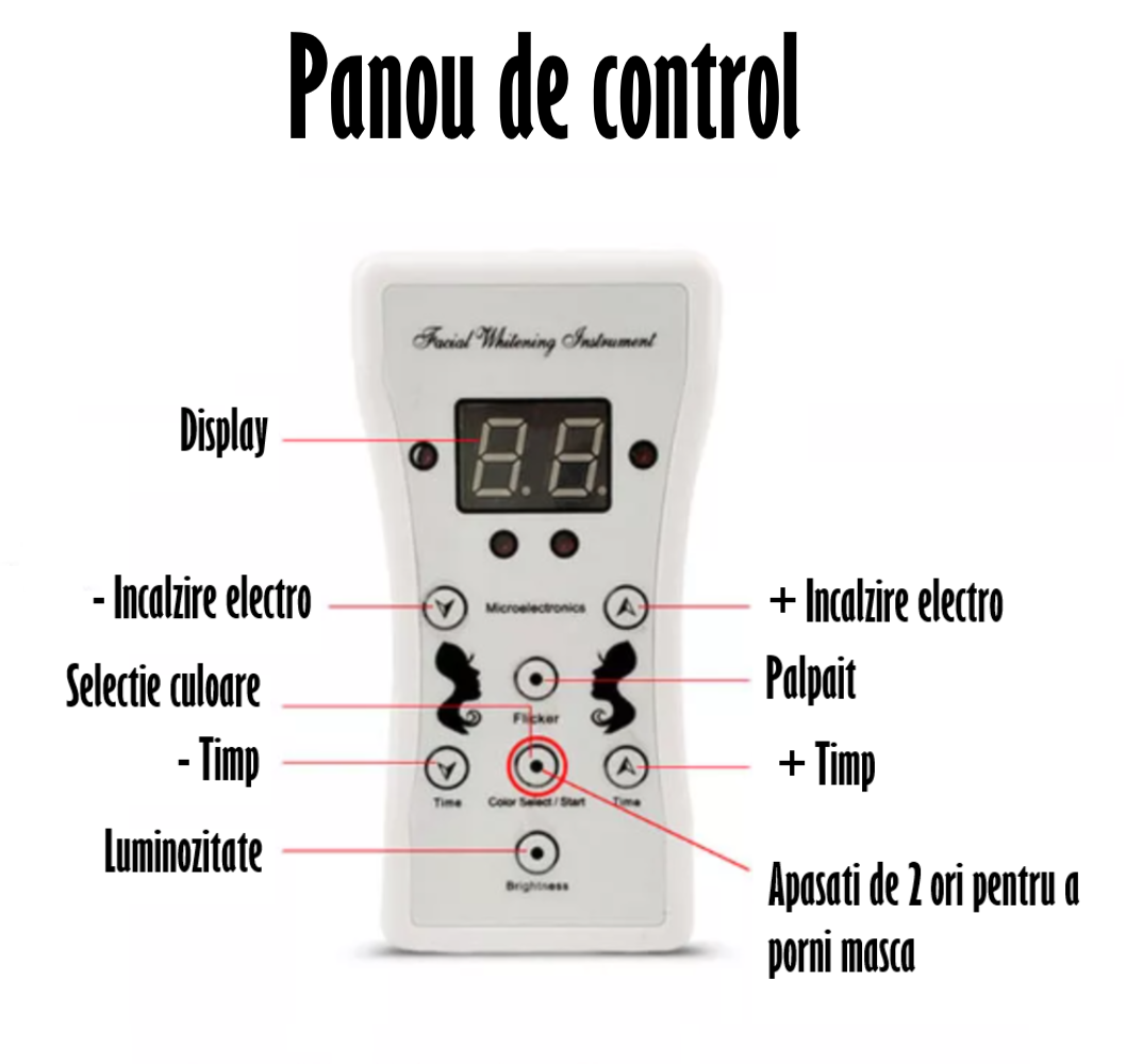 3.Utilizati telecomanda pentru a schimba modul de actionare al tratamentului, selectand culoarea luminii, luminozitatea si timpul sedintei.