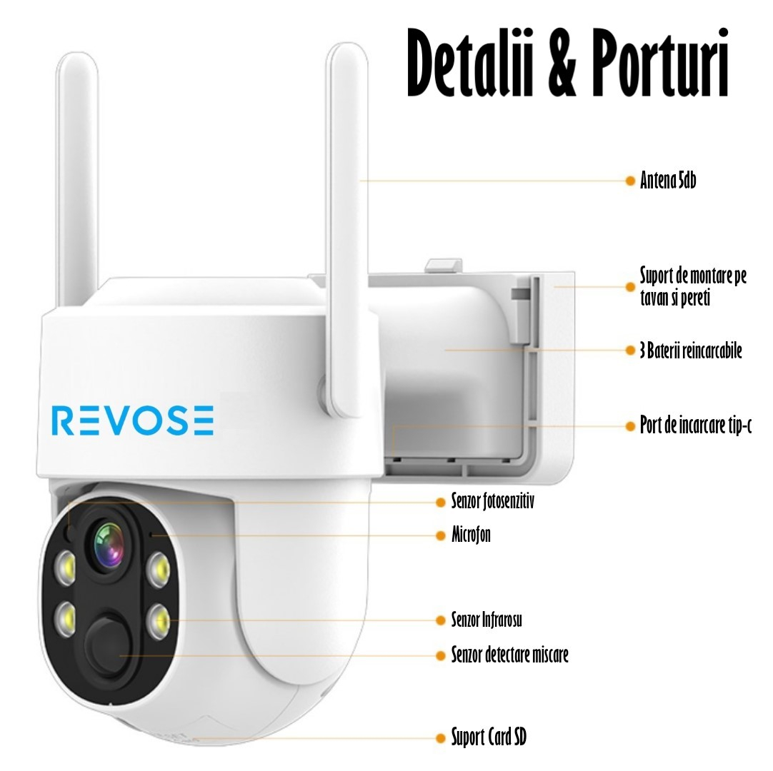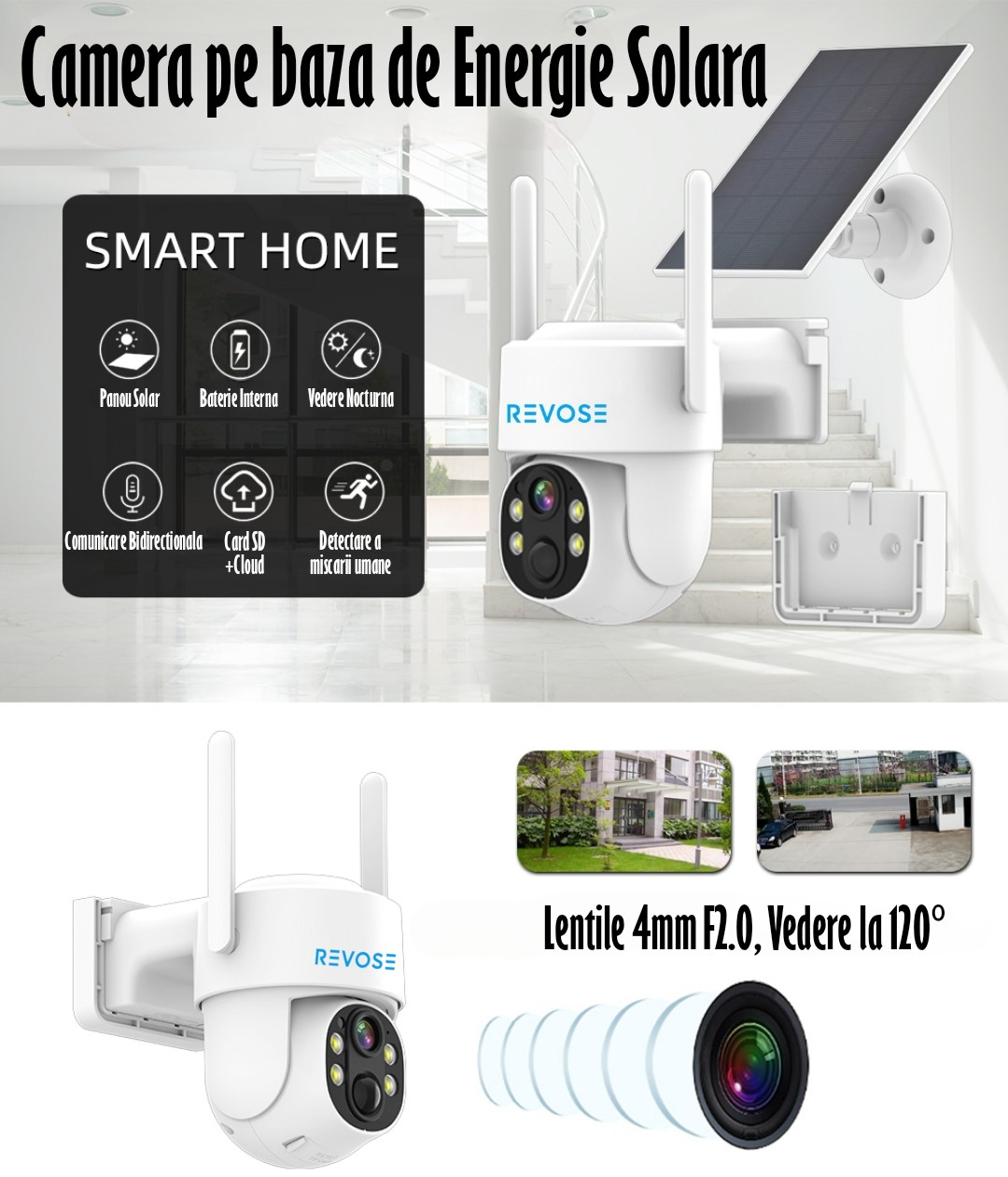 Camera de Supraveghere Video REVOSE™ 5MP 2560x1920, Aplicatie Dedicata, Intelligent Tracking, PTZ, WIFI, Lan, AP hotspot, Micro SD, Rotire, Alarma miscare, Interior si Exterior, cu Incarcare Solara