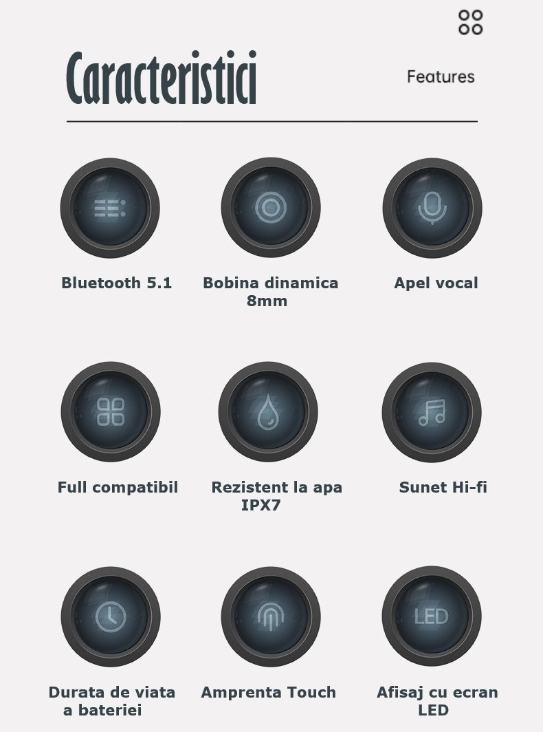 Afisajul LED inteligent arata puterea ramasa a carcasei de incarcare, va ajuta sa preziceti cu mai mare exactitate timpul de redare. Cea mai avansata tehnologie Bluetooth 5.1 creeaza o transmisie rapida si stabila. Pot fi asociate cu orice dispozitive compatibile Bluetooth la o distanta de pana la 33 de metri.