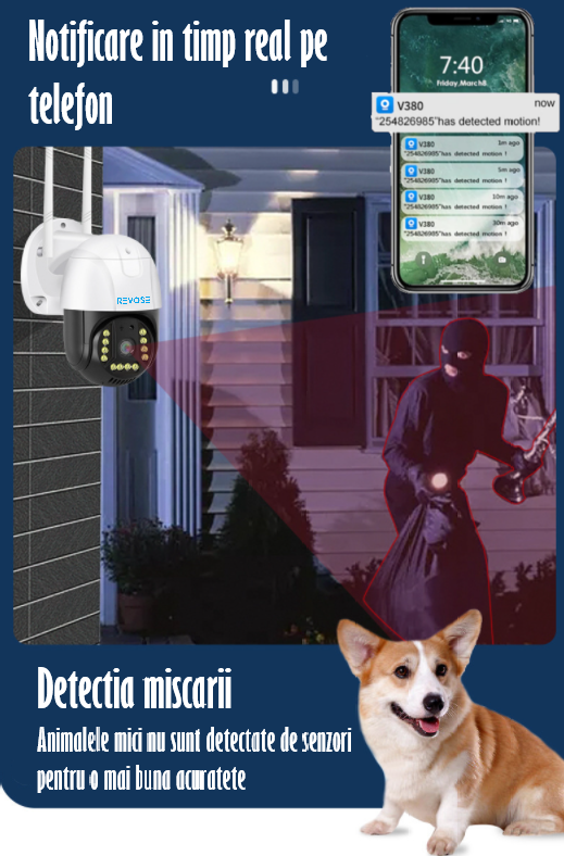 La detectarea miscarii, aceasta camera PTZ va captura si urmari automat miscarea, activand lumina stroboscopului pentru a speria intrusul cat timp va va trimite notificari pe telefonul dvs. (puteti porni de asemenea "Alarm Tone" in aplicatie pentru a activa o sirena galagioasa).