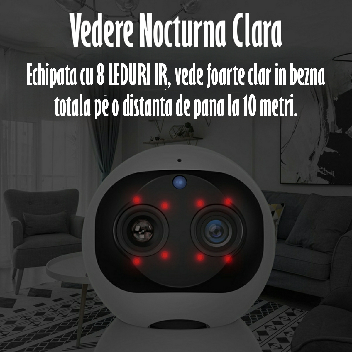 Camera se poate roti automat din aplicatie chiar in momentul cand vizualizati imaginea live. Este nevoie doar sa apasati sagetile de pe ecranul telefonului din aplicatie si camera se va roti automat sus, jos, stanga sau dreapta. 355° rotire si 110° sus/jos.