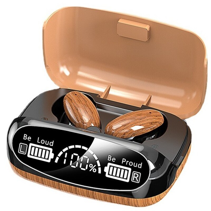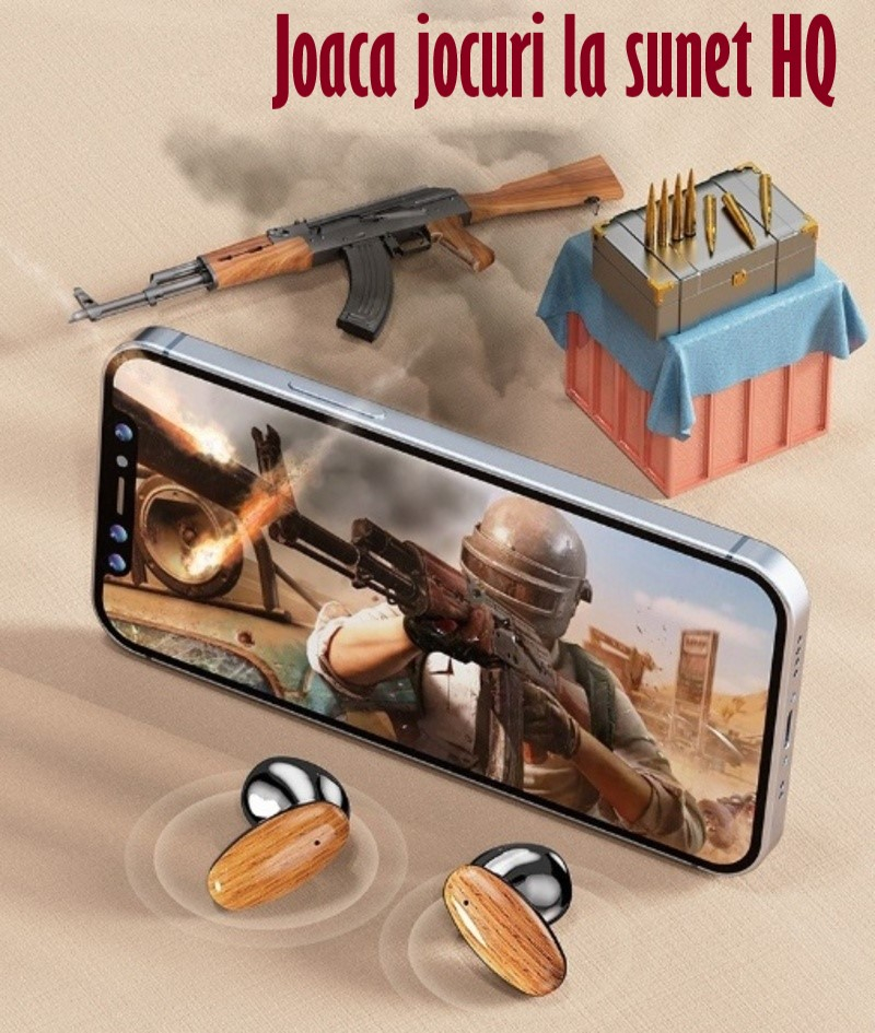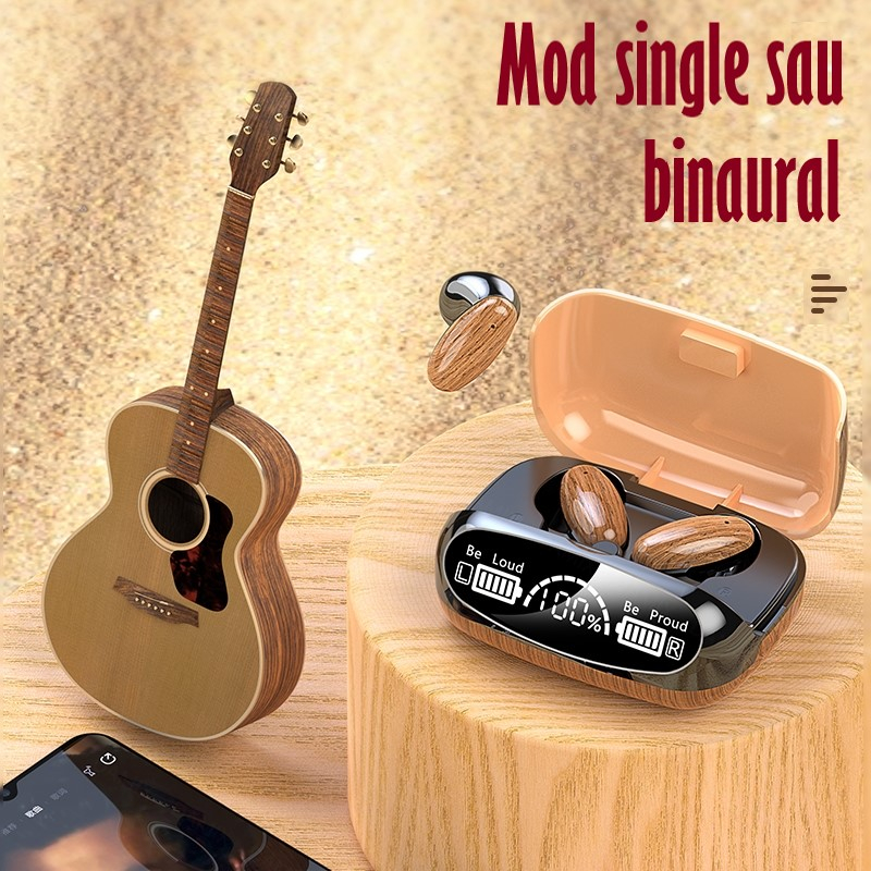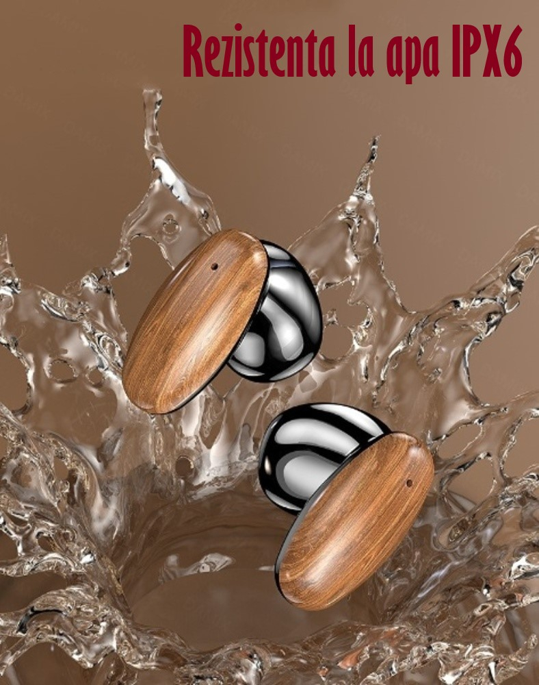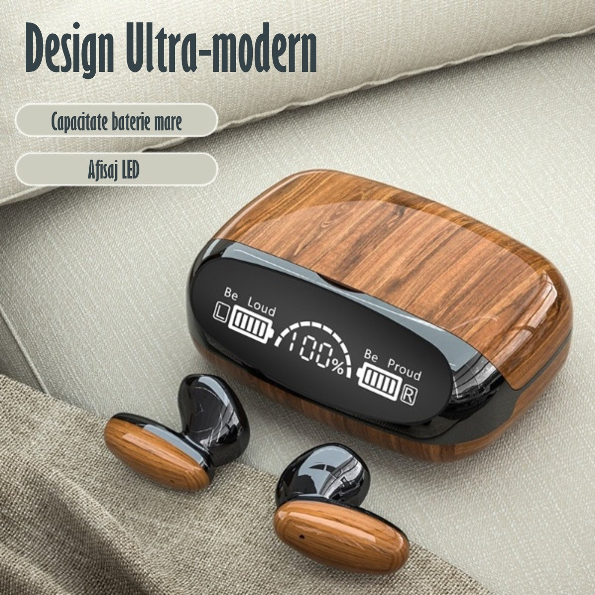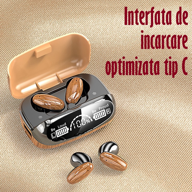 Casti Audio Wireless fara fir, Bluetooth 5.1, tip Earbuds cu Control Touch, Microfon, Noise Cancelling, True Wireless Stereo, tip Earpods Telefon, Universale, Carcasa magnetica, Lemn