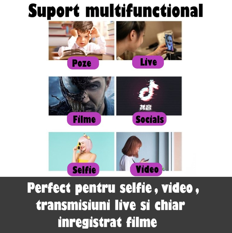 Produsul vine insotit de suport pentru telefon + un suport pe bratul extra, perfect pentru a falicilita filmarile si pozele make-up artistilor, bloggerilor, vloggerilor si a tututor din aceasta bransa. Posibiliate de adaptare oglinda pentru make up sau suport de telefon sau aparat foto video, iar suportul (stativul) va ofera posibilitatea sa o fixati in pozitia ideala.