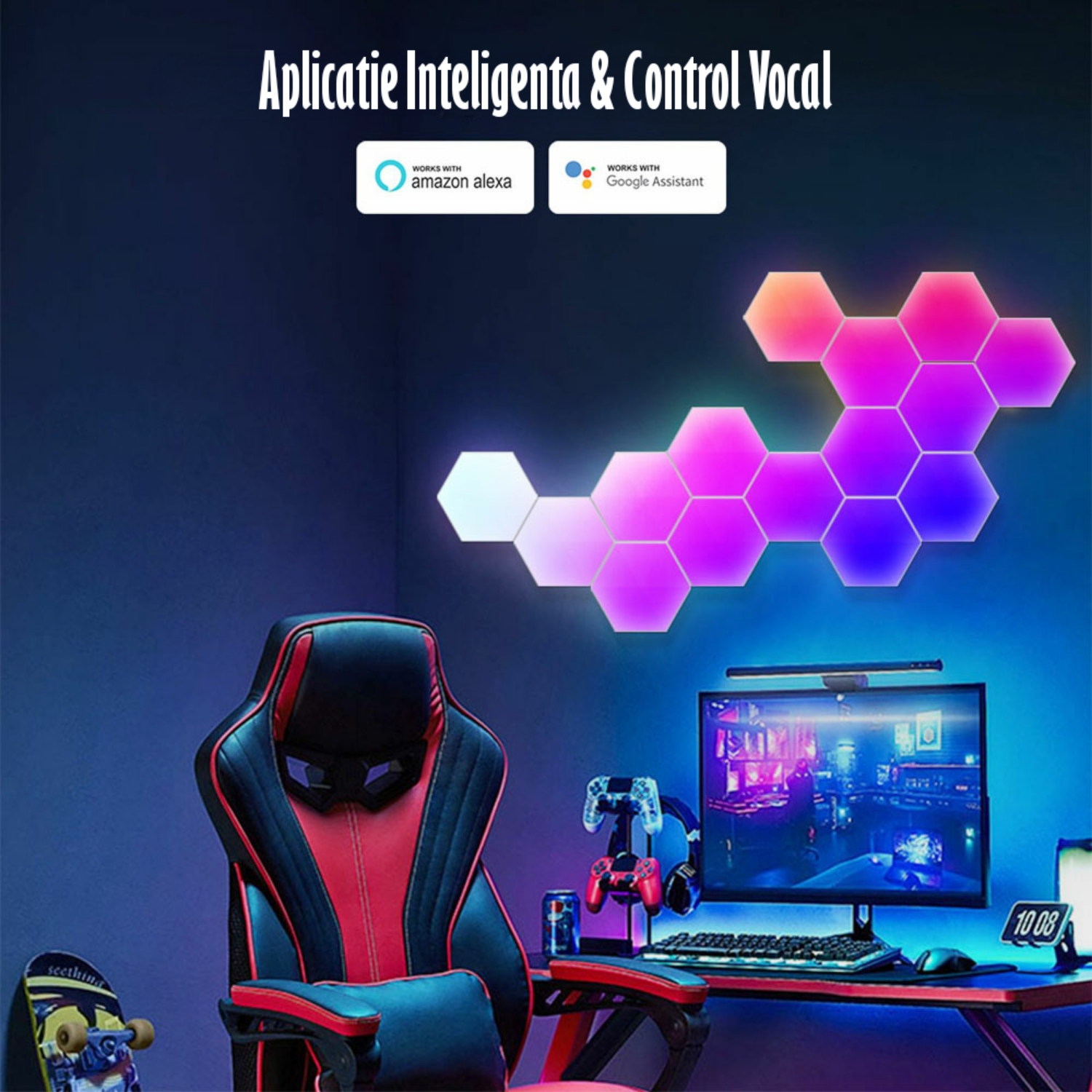 Cutie Rupta -Lampa Modulara Inteligenta tip Hexagon cu Aprindere prin Atingere Led RGB, 6 Panouri Tactile, Voice Control, App/control IOS/Android, Alexa/Google Home, Wi-Fi, Port USB, Telecomanda Inclu